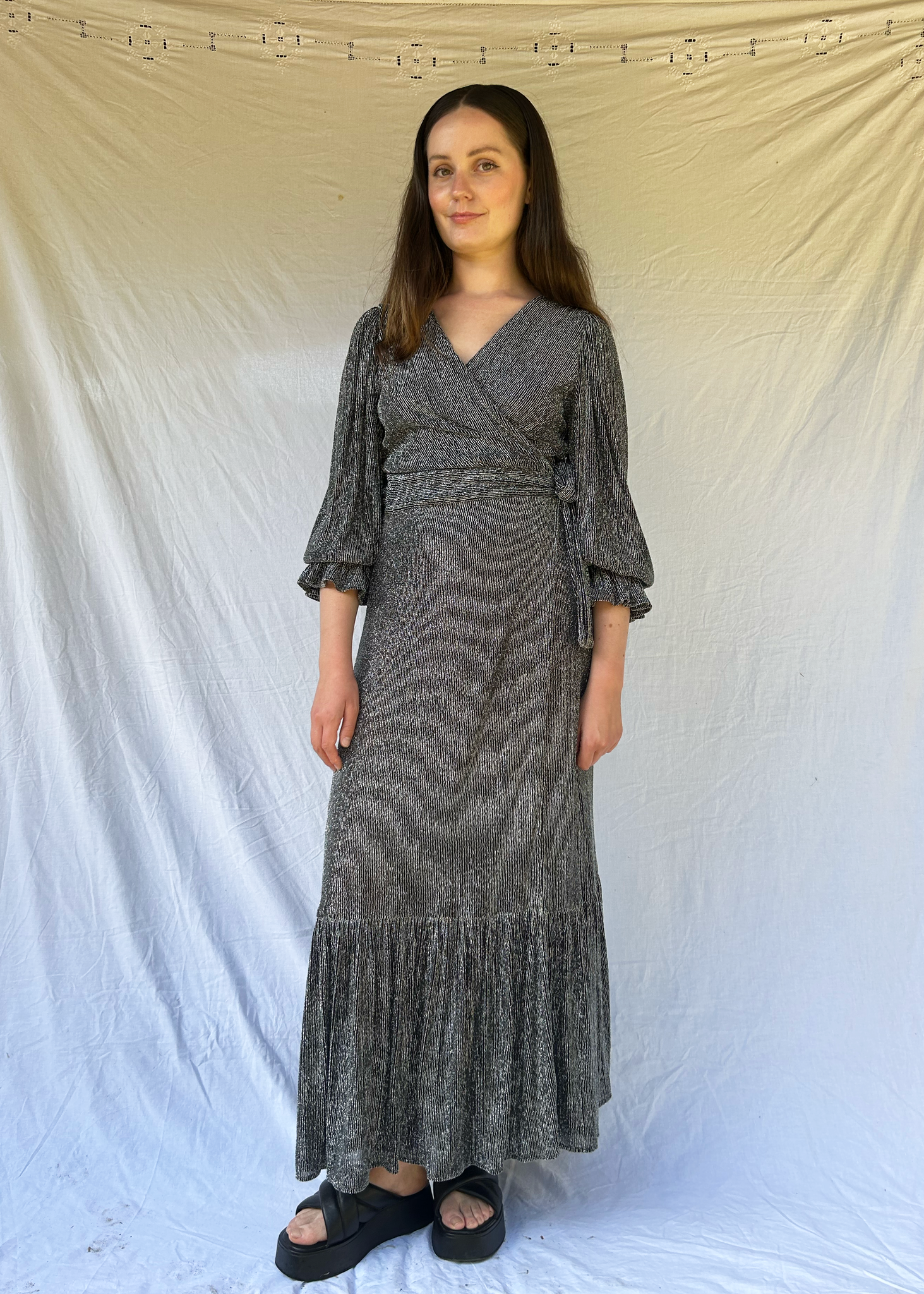 Silver sparkly show stopper! The ‘Ida’ wrap dress in stretch silver knit available in Size 1.
